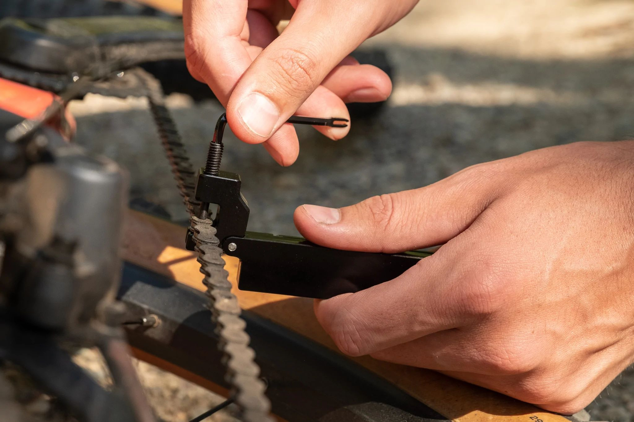 8-BIT CHAINBREAKER + UTILITY KNIFE MULTI-TOOL has four functions. It has a chainbreaker on one end and a retractable utility blade on the other. The chain tool is operated by an included 3mm hex L key that doubles as a tire plug inserter. A machined slot fits the L key and converts the entire multi-tool into a tire plug inserter, with the forked end of the L key extending outward. The handles of this multi-tool slide open to provide storage for tire plug inserts, a valve core, and a spare mini utility blade. The fourth function is the 16mm chainbreaker head that can be used to tighten a loose crankarm during rides.