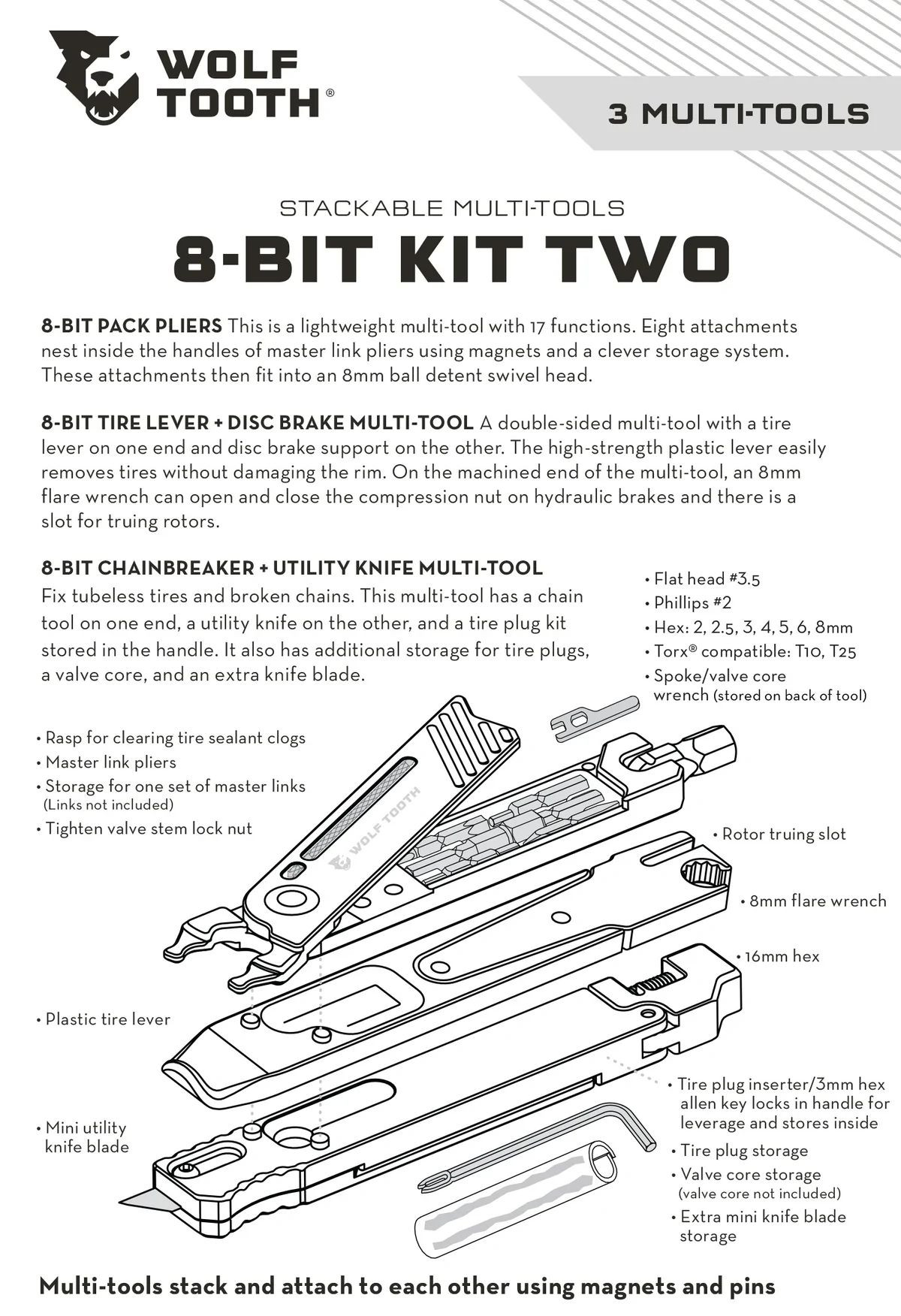 8-BIT PACK PLIERS MULTI-TOOL has 17 functions. On one end of the multi-tool, an 8mm hex swivel head serves as a driver for the bits that are stored inside: flat head #3.5 and phillips #2 screwdriver bits; 2, 2.5, 3, 4, 5, and 6mm hex; and T10 and T25 Torx-compatible bits. A spoke wrench and valve core wrench are stored on the back and a rasp is on the inside of the upper handle for clearing sealant from valve stems. On the other end of the multi-tool, pliers for master link installation/removal and tightening/loosening of valve stem nuts.