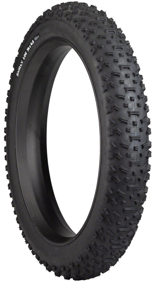 Surly Lou Tire. Lou is the 26” x 4.8” rear-specific mate to Bud. Lou’s tread is much like Bud’s with tall knobs designed to grind, crawl and claw its way over rooty, rocky, wet, muddy, loose or otherwise inhospitable terrain. Lou’s tread pattern is a bit different, however, made for stability while both braking and accelerating. Its casing is durable, thin-walled 120tpi which conforms well to the ground surface shape. Folding Kevlar bead.
