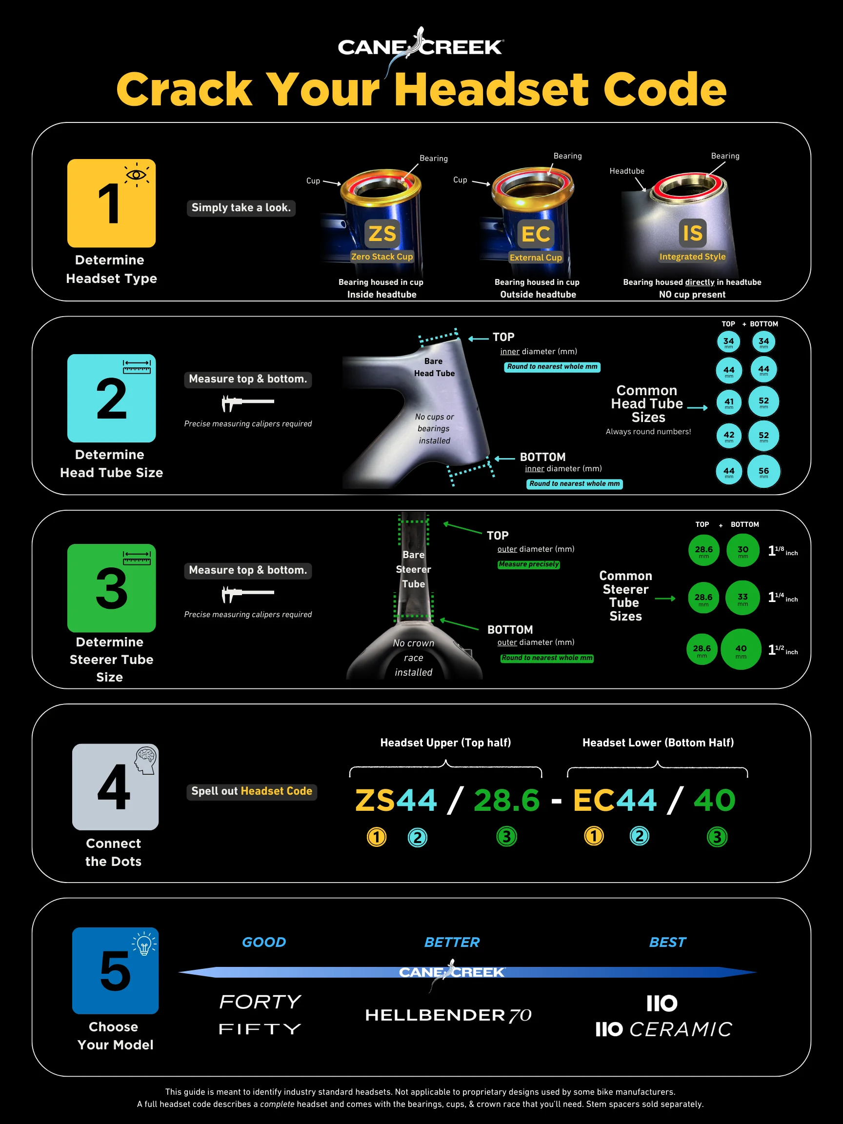 Though they are fairly simple components, bicycle headsets can be difficult to understand. There are a vast array of different configurations and sizes, and it can feel quite overwhelming when looking at all the possibilities. In 2010, Cane Creek introduced the Standardized Headset Identification System (SHIS) - an effort to establish a unified classification system by which we describe all modern headsets. The codified name is a series of letters and numbers that describe its relevant dimensions, as well as how it fits into the bike frame.Â