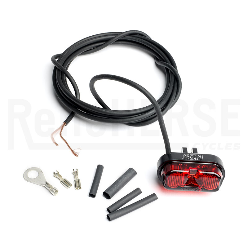 - The taillight comes with a co-axial cable to connect to the headlight. One pole connects to the taillight tab of the SON Edelux headlight, the other to the (grounded) housing of the headlight. (A round connector is included that can be placed under the mounting bolt of the Edelux headlight.)