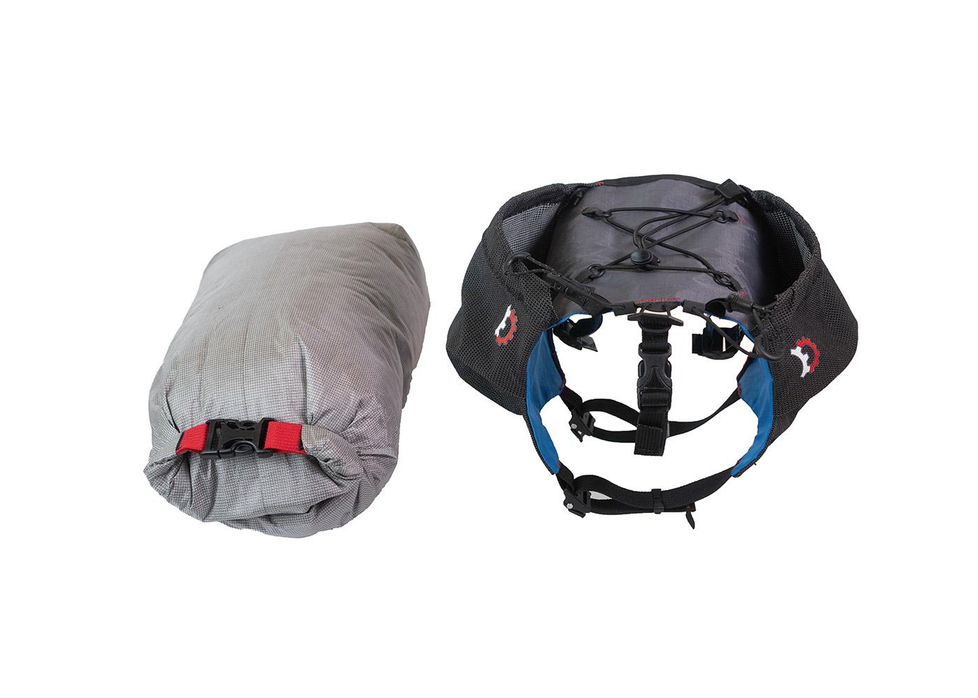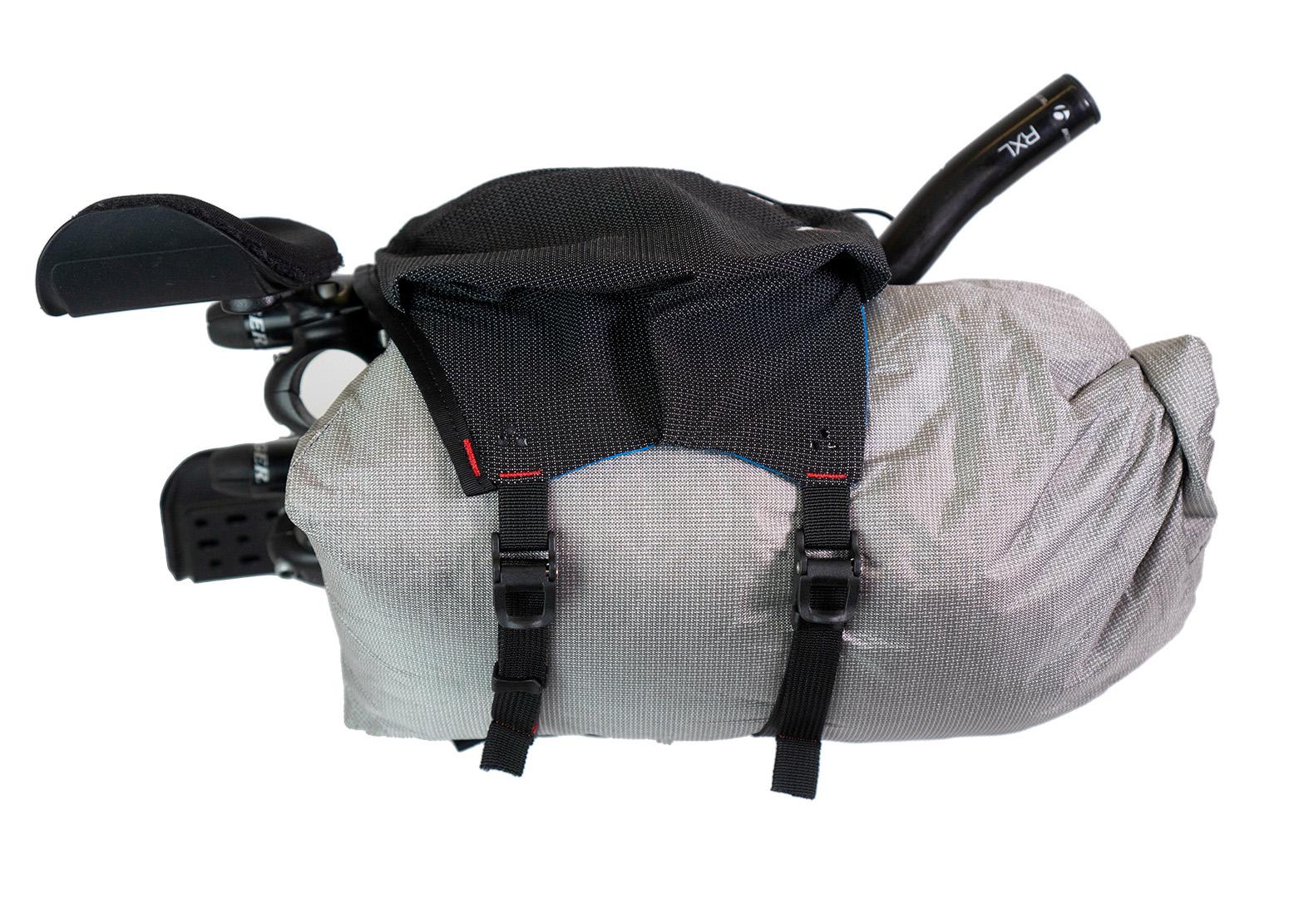 The seam taped Ultra 200 UHMWPE drybag has an asymmetrical tapered bottom for stem clearance and is sized to fit a light sleeping/shelter system or warm clothing and rain gear. A removable front strap can be used to tension the front of the drybag if using it fully packed on rough terrain. The drybag is secured to the holster with spring loaded, non-dangling auto cam buckles.