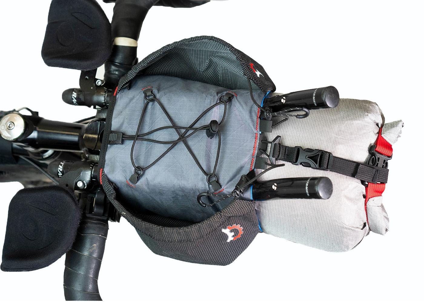 The Pitchfork is a 2-part holster system featuring gigantic stretch woven side pockets with a removable 6 Ultra 200 denier drybag. The pockets easily swallow light clothing layers and can securely stow calories from a gas station resupply. To optimize the size of the pockets the holster wraps over the bars rather than strapping underneath. This allows for both bigger pockets and provides fast access to a flat platform top mounted bungee system. Everything is designed for quick access and all cords are field replaceable for the long haul.