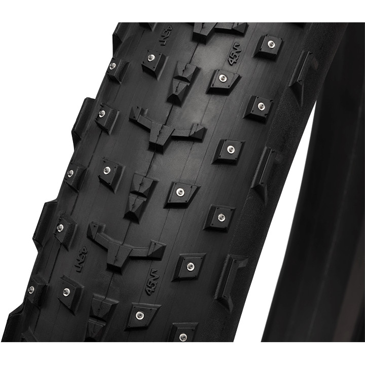 Dillinger 4 is a fast traction studded fat bike tire. The tightly spaced center tread rolls quickly, while taller, braced side lugs improve cornering in snowy conditions. Carefully positioned studs allow for railing icy, off-camber singletrack with confidence and control.