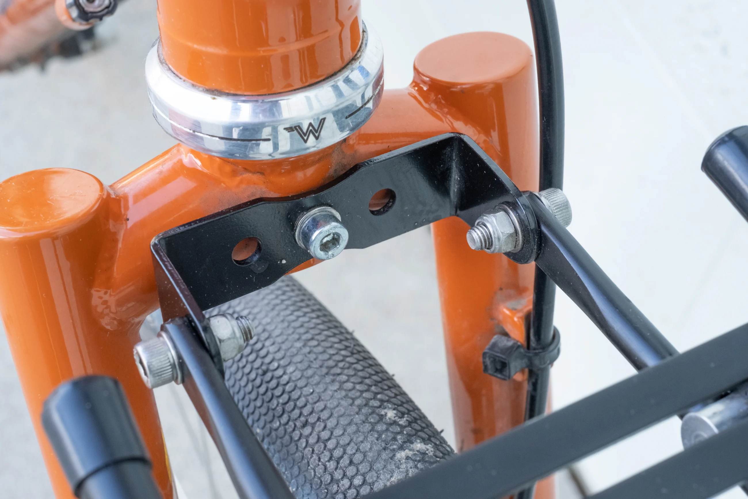 This powder coated steel rack adaptor mounts to the center fork crown hole on your steel or aluminum fork (or carbon fork if the manufacturer allows it) and gives you two fork crown mounting points for our rack struts.