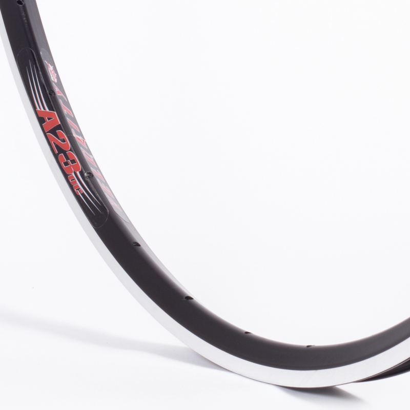 Velocity A23 700c Machine SideWalled With a wider footprint, the A23 allows for a more aerodynamic rim/tire combination when paired with a 23c tire. The tire profile mimics the characteristics of a tubular, gaining increased control and lower rolling resistance without the inconvenience of tubular glue or the dangers of irreparable roadside mechanicals. A tubeless ready design makes this rim ideal for road and cyclocross applications. Tight tolerances require the use of a low profile rim tape to avoid tire installation issues. Veloplugs are not recommended on A23 or A23 OC rims. Specs: Tubeless ready Machined Sidewalls for use with rim brakesWidth: 23mm, Internal Width: 18mm, Height 19,5mmWeight: 450g28/32/36 Spokes, Black, Silver Polished